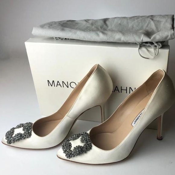 Close esc White satin evening pump with a light blue crystal embellished ornament from Manolo Blahnik. The Hangisi pump has a slightly pointed toe a covered heel measuring approximately 70mm 28 high and cream leather lining. Blahniks stunning shoes are instantly recognisable thanks to their signature stiletto heel and luxurious texture. Buy Manolo Blahnik Womens Hangisi Bridal 70 Ivory Satin Pumps. I got this insize 345heel is 105Color Ivory SatinFor some informationIm wearing YSL s. 68 viscose 32 silk. White textile pumps from Manolo Blahnik. White satin almond toe pumps featuring a square crystal buckle encased in a gunmetal frame. View the dedicated collection of wedding shoes for men.